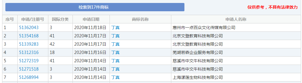 据商标局网站查询得知,自11月以来,“丁真”商标已被多家公司抢注,包括惠州市一点百众文化传媒有限公司、北京文登教育科技有限公司、芜湖若森企业服务有限公司等,类别涉及日化用品、教育娱乐、网站服务等,目前这7件“丁真”商标均处于等待受理阶段。其中,最早一件“丁真”商标的申请时间为11月14日,与丁真蹿红网络的时间基本一致。
