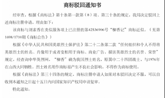 近日,从网络上看到一个报道,广西柳州的李先生所在单位桂留香公司委托某代理机构申请注册的商标“柳香”,在接到申请受理通知书四个月后,被国家知识产权局以“与烈士姓名同名易产生不良影响”的理由驳回。