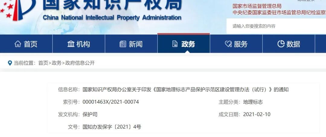 国家知识产权局办公室关于印发《国家地理标志产品保护示范区建设管理办法(试行)》的通知