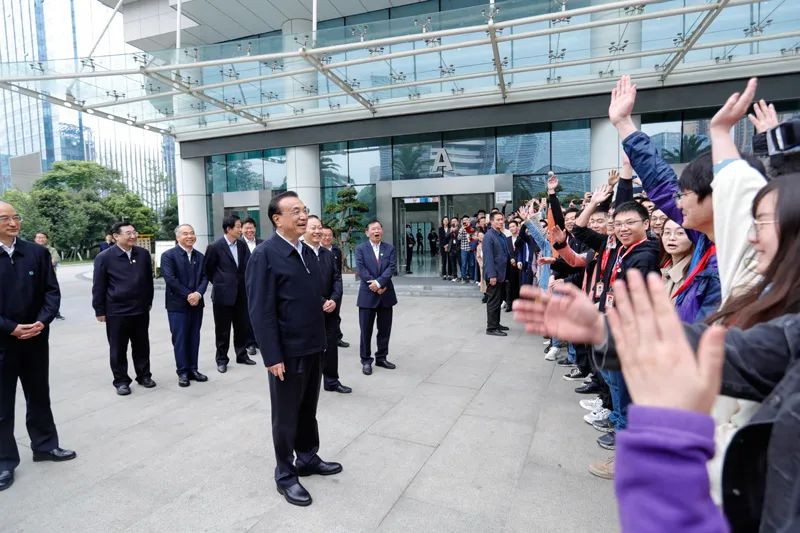 图为4月20日,李克强在成都长虹研发中心大楼外与企业员工交流。