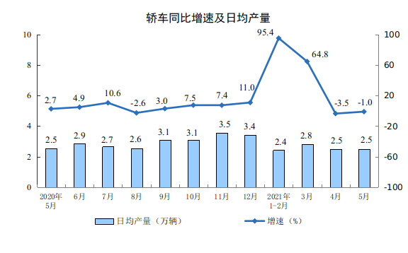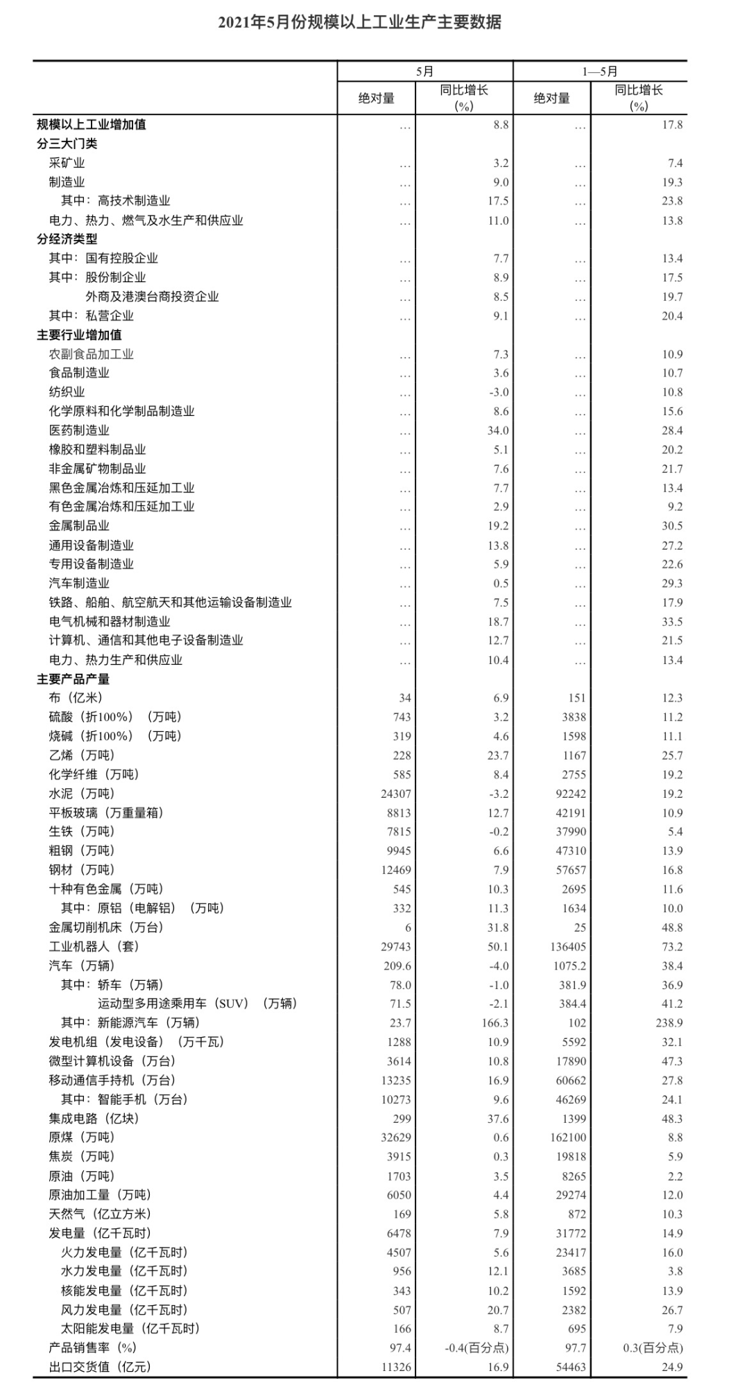 5月份,规模以上工业增加值同比实际增长8.8%(以下增加值增速均为扣除价格因素的实际增长率),比2019年同期增长13.6%,两年平均增长6.6%。从环比看,5月份,规模以上工业增加值比上月增长0.52%。1-5月份,规模以上工业增加值同比增长17.8%,两年平均增长7.0%。