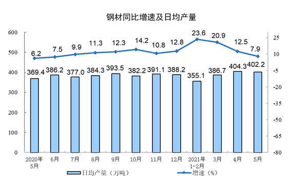 分产品看,5月份,612种产品中有428种产品产量同比增长。钢材12469万吨,同比增长7.9%;水泥24307万吨,下降3.2%;十种有色金属545万吨,增长10.3%;乙烯228万吨,增长23.7%;汽车209.6万辆,下降4.0%,其中,新能源汽车23.7万辆,增长166.3%;发电量6478亿千瓦时,增长7.9%;原油加工量6050万吨,增长4.4%。