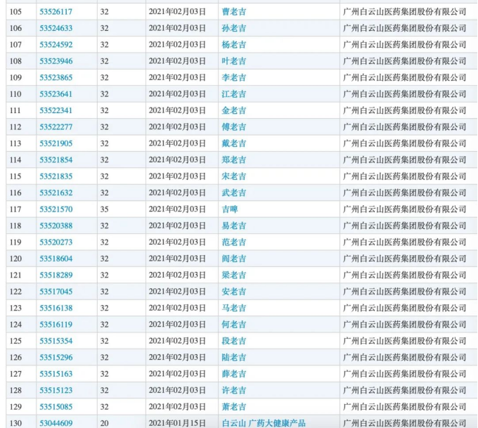“萧老吉、程老吉、赵老吉、孙老吉……”中国商标网公开信息显示,这些商标均是在2021年2月3日一天之内申请的,共计100个。且这些商标申请的均非30类凉茶商品,而是在32类啤酒、茶味非酒精饮料、果汁等商品中。
