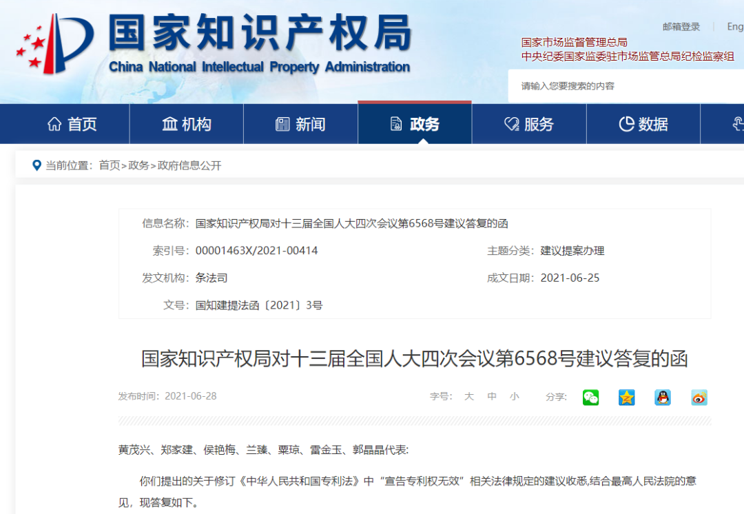 近日,国家知识产权局发布对十三届全国人大四次会议第6568号建议答复的函。其中提到,根据我国专利法规定,自国务院专利行政部门公告授予专利权之日起,任何单位或者个人认为该专利权的授予不符合法律有关规定的,可以请求国务院专利行政部门宣告该专利权无效。