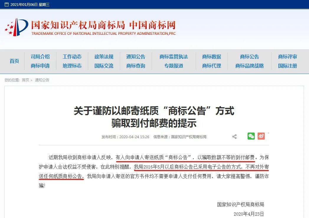 2020年4月23日,国家知识产权局商标局发布《关于谨防以邮寄纸质“商标公告”方式骗取到付邮费的提示》: