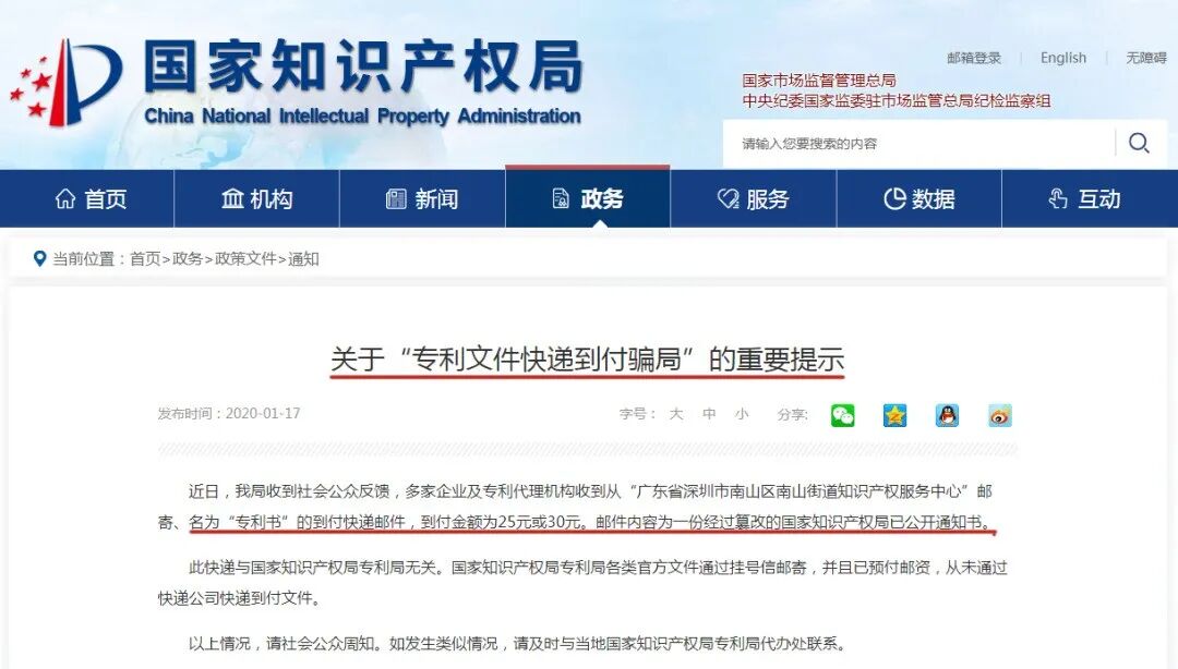 2020年1月15日,国家知识产权局专利局发布《关于“专利文件快递到付骗局”的重要提示》: