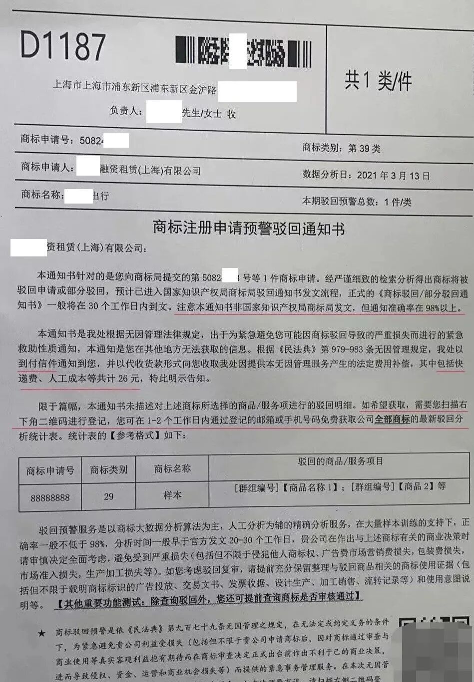 条文规定看起来并无异样,但是该通知中标注预测商标驳回准确率在98%以上,就有些荒谬了。除了商标驳回的概率本来就有一些不确定性之外,部分商标是经过代理机构认真检索分析过后才提交申请的,如果该通知中的预测能力这么准确的话,市场上广大代理机构存在的意义在哪呢?