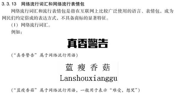 其次根据最新的商标审查审理指南下编第四章第三款第三条的最新商标审查和审判指导,网络流行词汇和网络流行符号指的是在互联网上广泛使用的语言和表情符号,成为网民普遍表达式和没有商标的独特的特点。