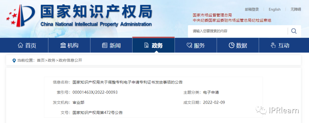 为贯彻落实党中央、国务院关于数字政府改革建设的决策部署,增强数字政府效能,国家知识产权局将推行专利审查服务全面电子化,实现专利审批“一网通办”。自2022年3月1日(含当日)起,国家知识产权局不再接收专利电子申请的纸质专利证书请求,相关专利证书仅通过电子专利申请系统发放。电子专利证书的真实性可通过中国专利电子申请网进行验证。