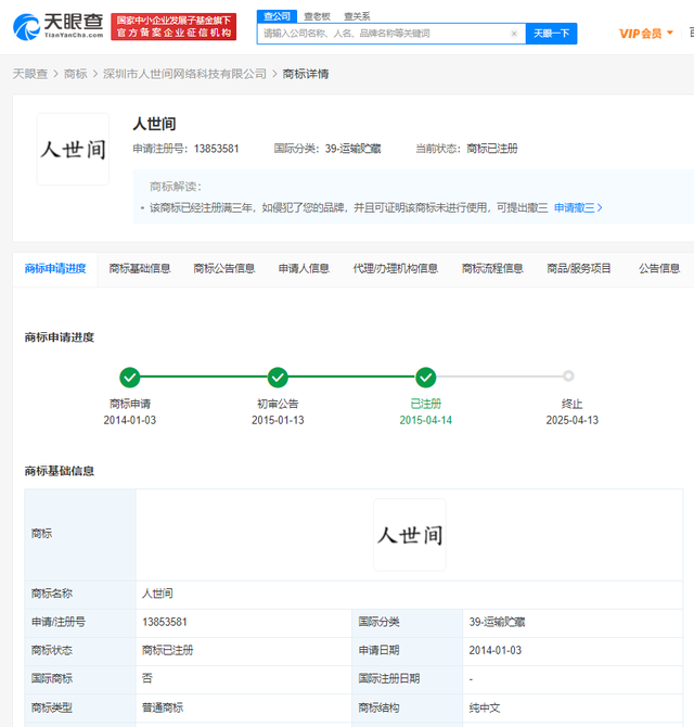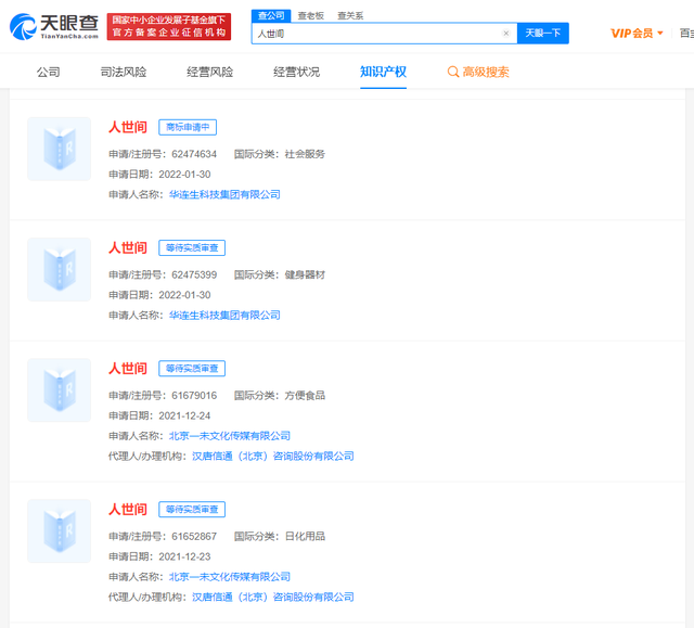 值得一提的是,10余枚申请于2021年及之前的“人世间”商标已注册成功,最早申请时间为2014年1月。
