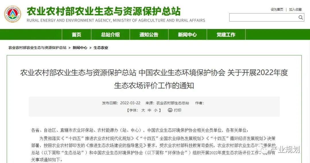 为贯彻落实《“十四五”推进农业农村现代化规划》《“十四五”全国农业绿色发展规划》《“十四五”循环经济发展规划》决策部署,按照农业农村部印发的《推进生态农场建设的指导意见》要求,受农业农村部科技教育司委托,农业农村部农业生态与资源保护总站和中国农业生态环境保护协会组织开展2022年度生态农场评价工作。