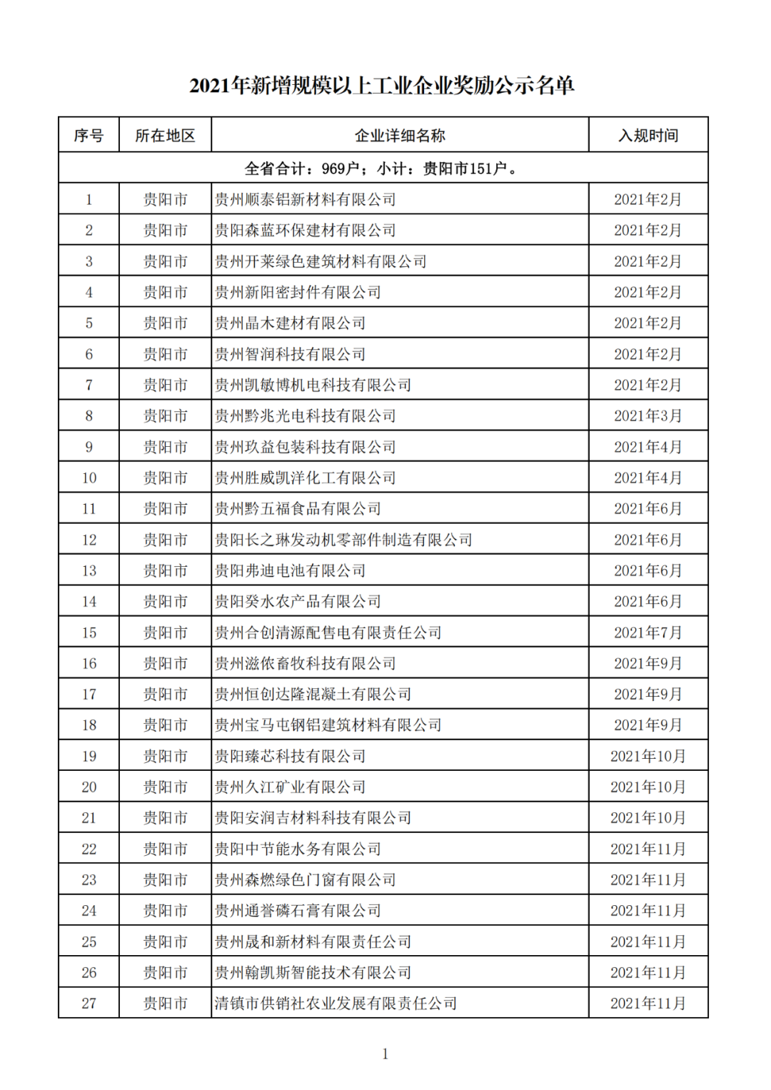 根据《省工业和信息化厅关于印发2021年新增规模以上工业企业培育计划的通知》《省财政厅关于印发支持新型工业化若干财政政策措施的通知》等有关文件,省工业和信息化厅组织各市(州)、贵安新区工信部门申报了2021年新增规模以上工业企业奖励名单,并对照省统计局反馈的名录进行初审后,再次反馈各市(州)、贵安新区工信部门进行了复核,现对拟奖励企业名单进行公示。
