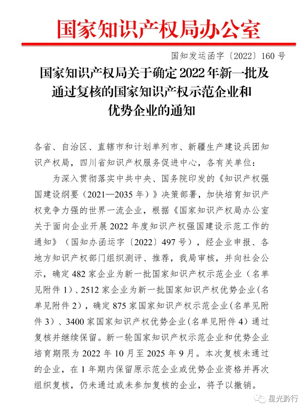根据《国家知识产权局关于确定 2022 年新一批及通过复核的国家知识产权示范企业和优势企业的通知》(国知发运函字〔2022〕160 号,见附件)公布的结果,中国航发贵州红林航空动力控制科技有限公司等 2 家企业被确定为国家知识产权示范企业,中伟新材料股份有限公司等 10 家企业被确定为国家知识产权优势企业,新一批国家知识产权示范企业和优势企业培育期限为三年(自 2022 年 10 月至 2025 年 9 月)。为认真做好国家知识产权示范企业和优势企业培育工作,加快形成一批知识产权竞争力强的知名企业,特提出如下工作要求。