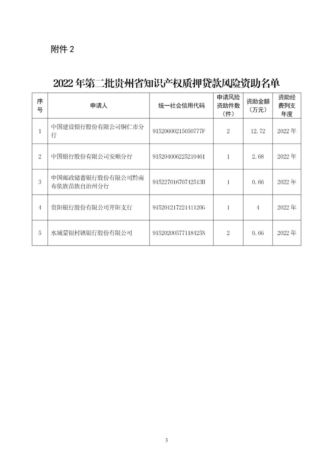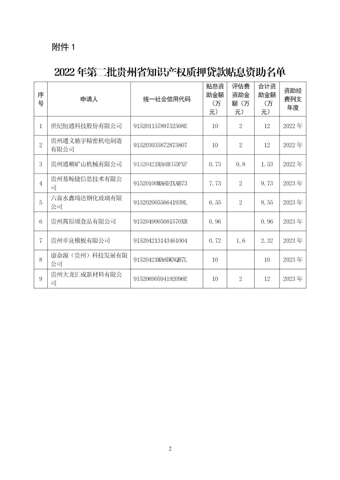 附件:1.2022年第二批贵州省知识产权质押贷款贴息资助名单