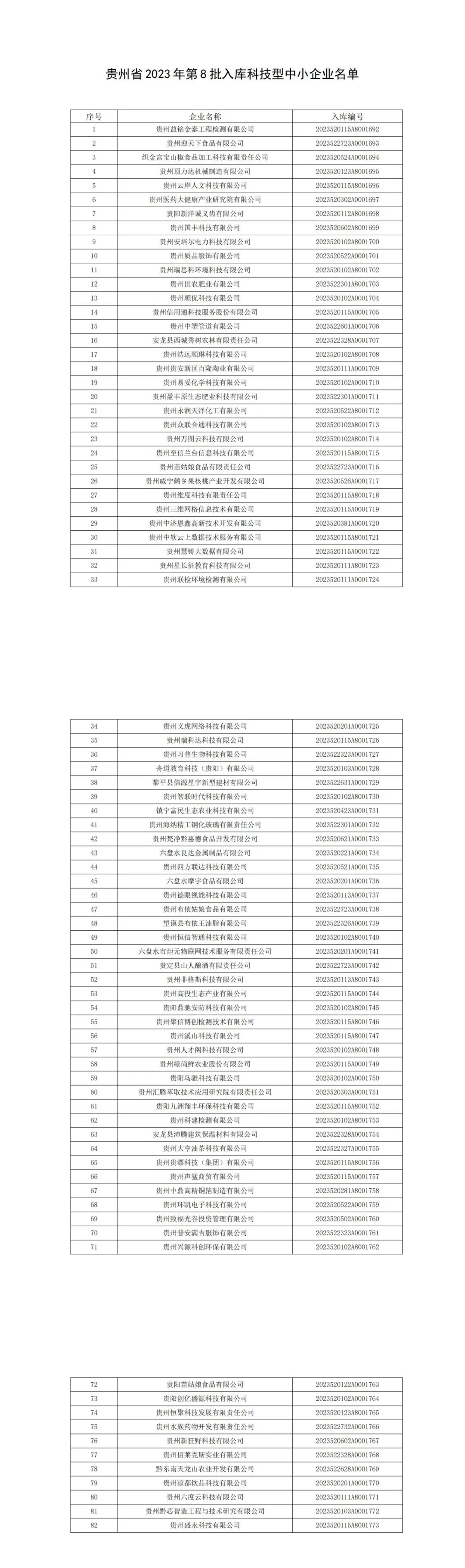 根据《科技型中小企业评价办法》(国科发政〔2017〕115号)、《科技型中小企业评价服务工作指引》(国科火字〔2022〕67号)的要求,经公示通过,现将贵州省2023年第八批82家入库科技型中小企业名单(详见附件)予以公告。