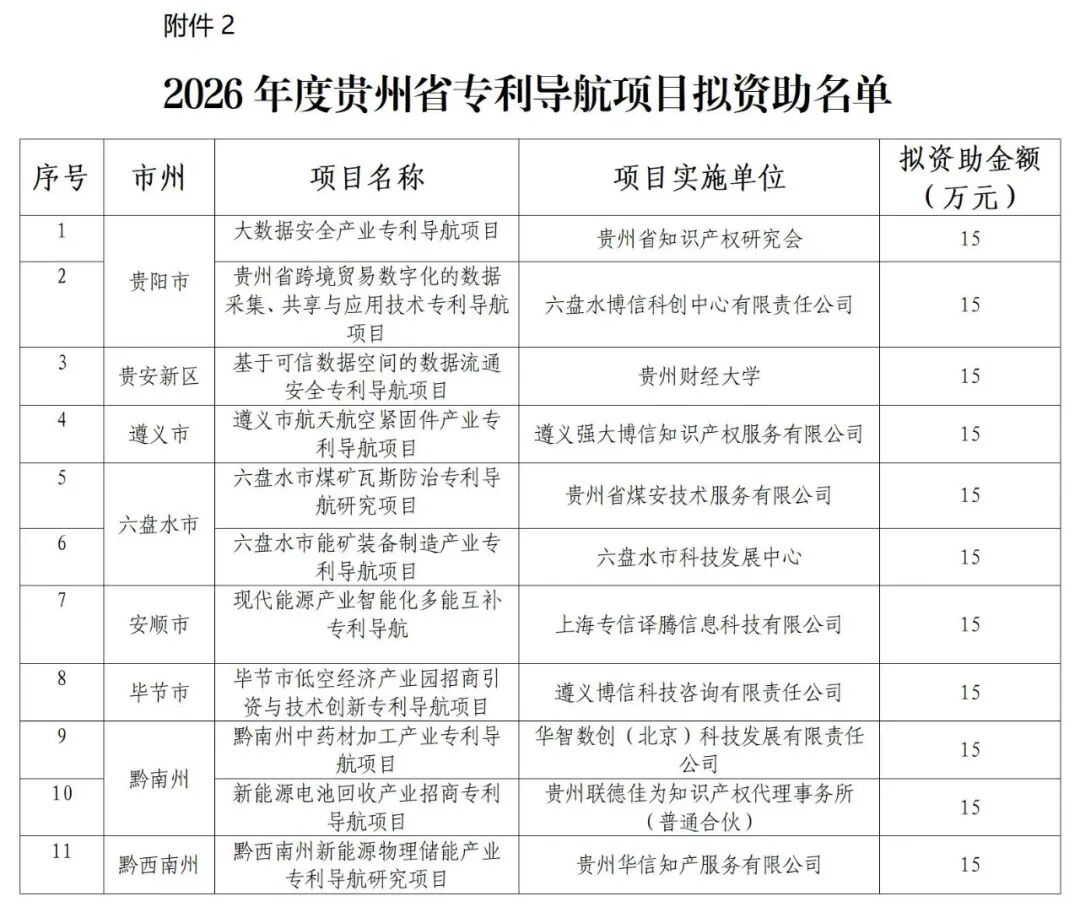 经自愿申报、资料审核、专家评审、省市场监管局党组会议审议通过,现将2025年度贵州省创新管理知识产权管理指南分级评价拟资助名单和2026年度贵州省专利导航项目资助名单予以公示。公示期为5个工作日(2025年11月28-12月4日),如有异议,请于公示期间实名向省市场监管局(省知识产权局)知识产权运用促进处反映,并提供必要的印证材料。联系人:刘超,电话:0851-85825390。
