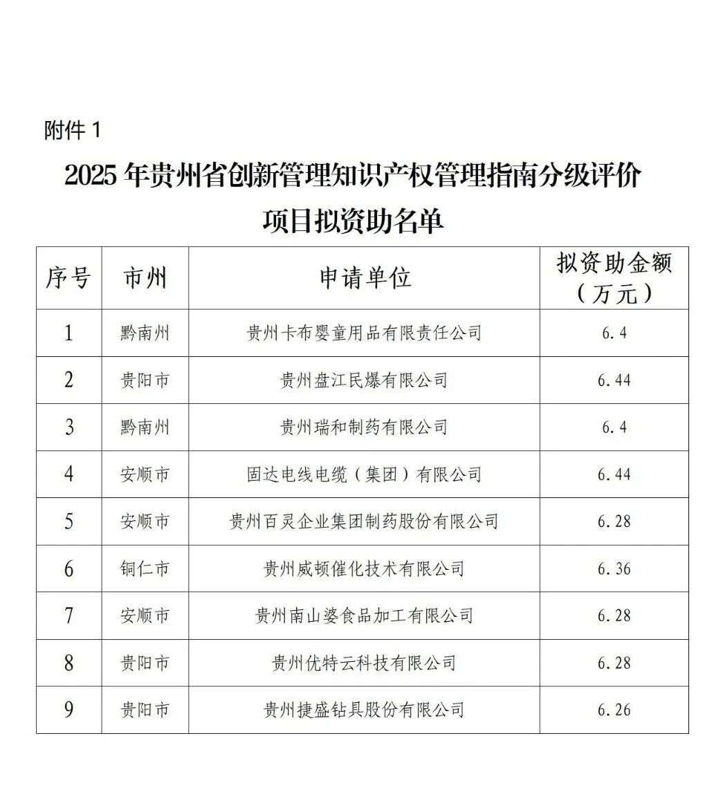 附件: 1.2025年贵州省创新管理知识产权管理指南分级评价拟资助名单