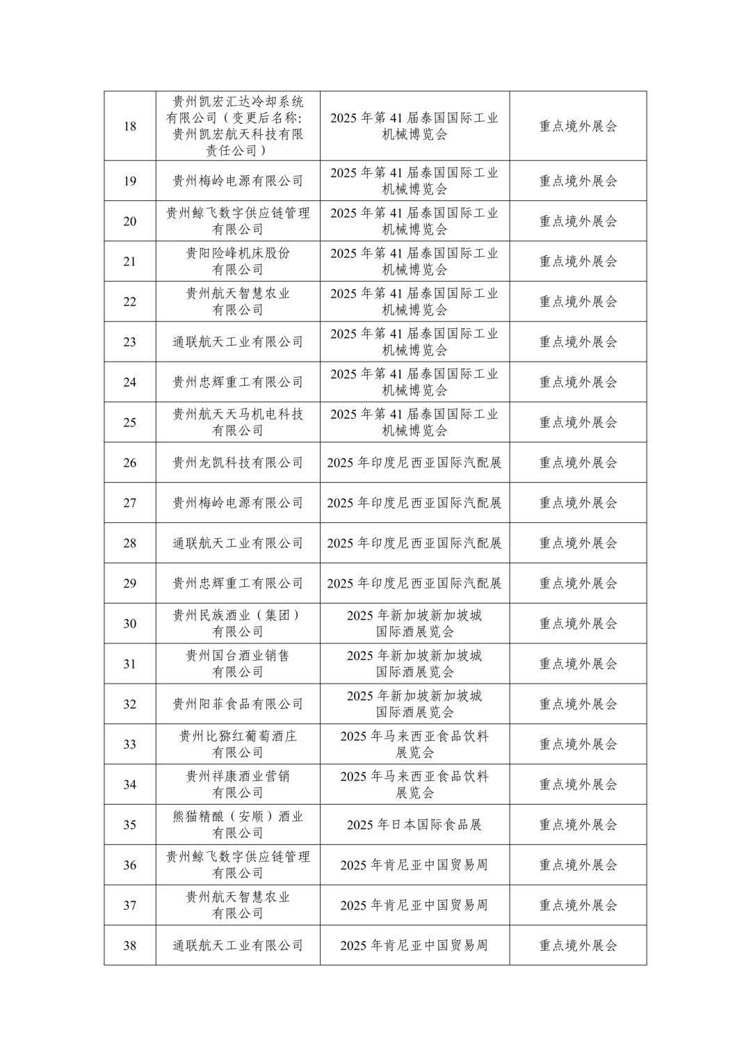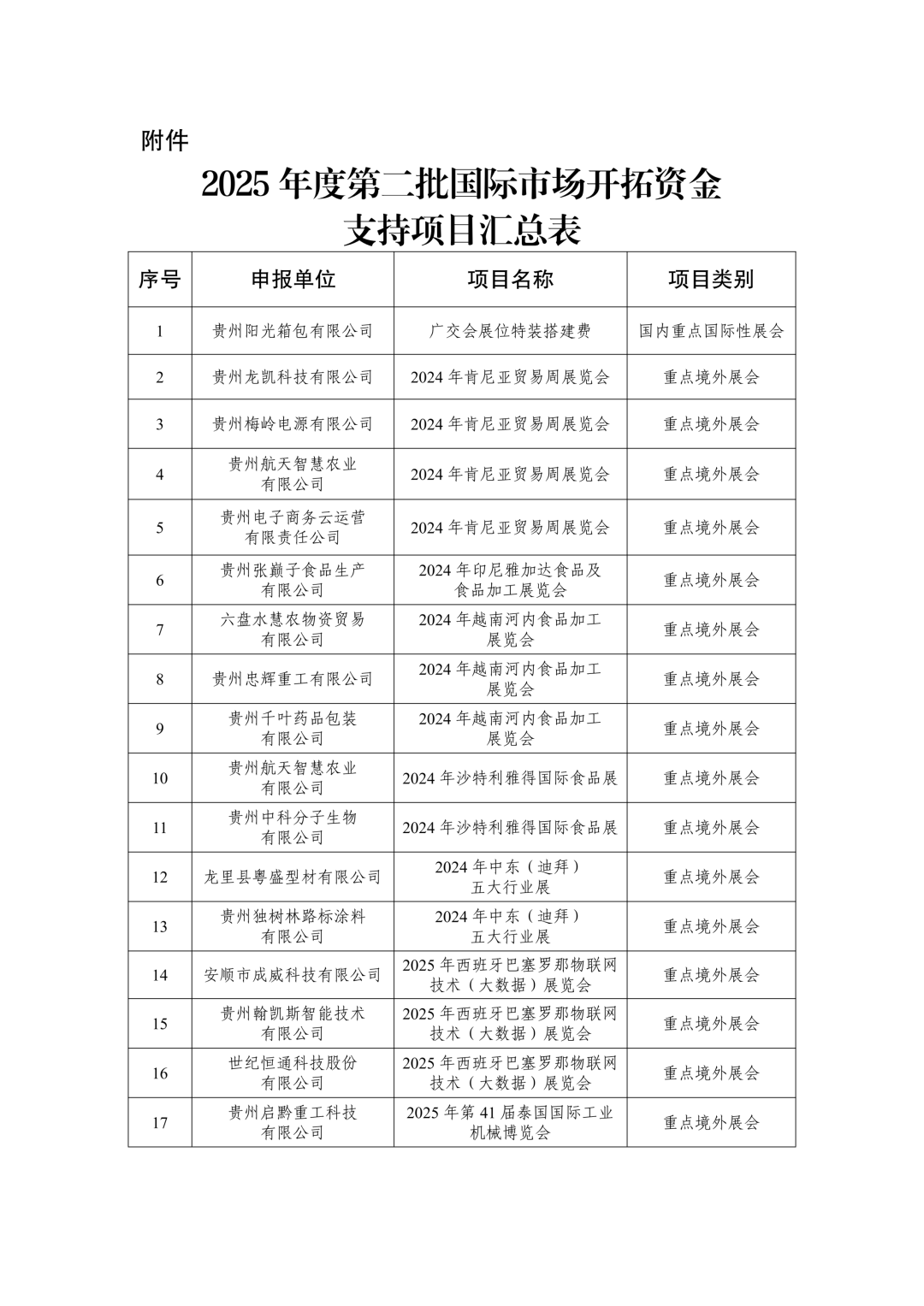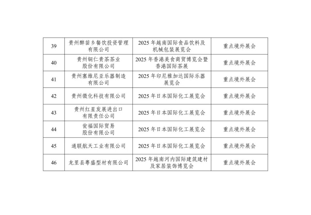 根据《财政部办公厅 商务部办公厅2024年度外经贸发展专项资金有关工作的通知》、《贵州省财政厅 贵州省商务厅关于印发<贵州省中央外经贸发展专项资金管理实施细则(修订)>的通知》(黔财工〔2024〕179号)、《省商务厅关于做好2025年度国际市场开拓资金申报管理工作的通知》(黔商发〔2025〕9号)要求,经企业自愿申报,市(州)商务局初审,省商务厅与第三方机构复审复核,2025年度第二批国际市场开拓资金支持项目共有46个。现向社会公示(详见附件),如有异议,请与省商务厅国贸处联系。