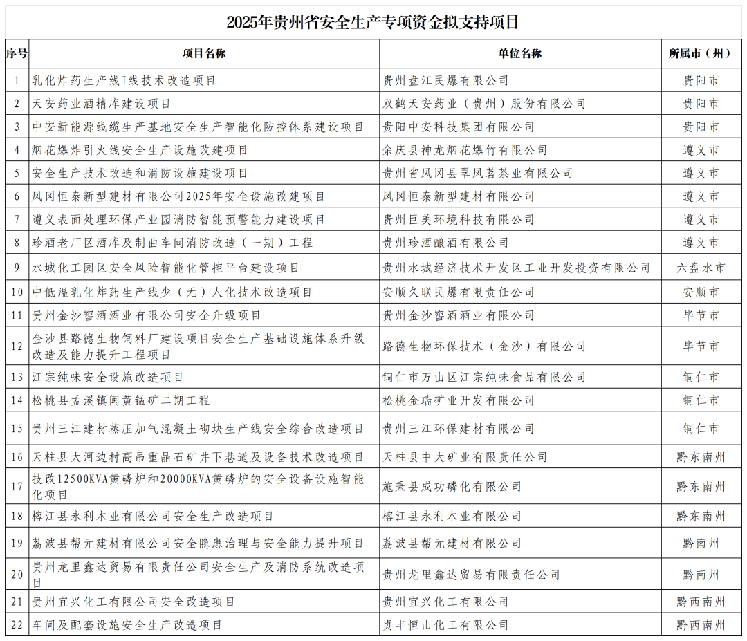 根据《省财政厅关于印发<贵州省省级预算项目库管理办法(试行)>的通知》(黔财编〔2021〕5号)《贵州省安全生产专项资金管理暂行办法》(黔财资环〔2024〕51号)和《省工业和信息化厅关于组织申报2026年省安全生产专项资金项目的通知》等要求,经处室初审、实地调研、专家评审、处务会研究、厅务会议审定等程序,筛选出符合资金投向项目22个,现予公示(见附件)。公示期为2026年4月2日-4月8日。公示期间,如有异议,请及时与省工业和信息化厅联系,联系电话:0851-88668015、0851-88668059。