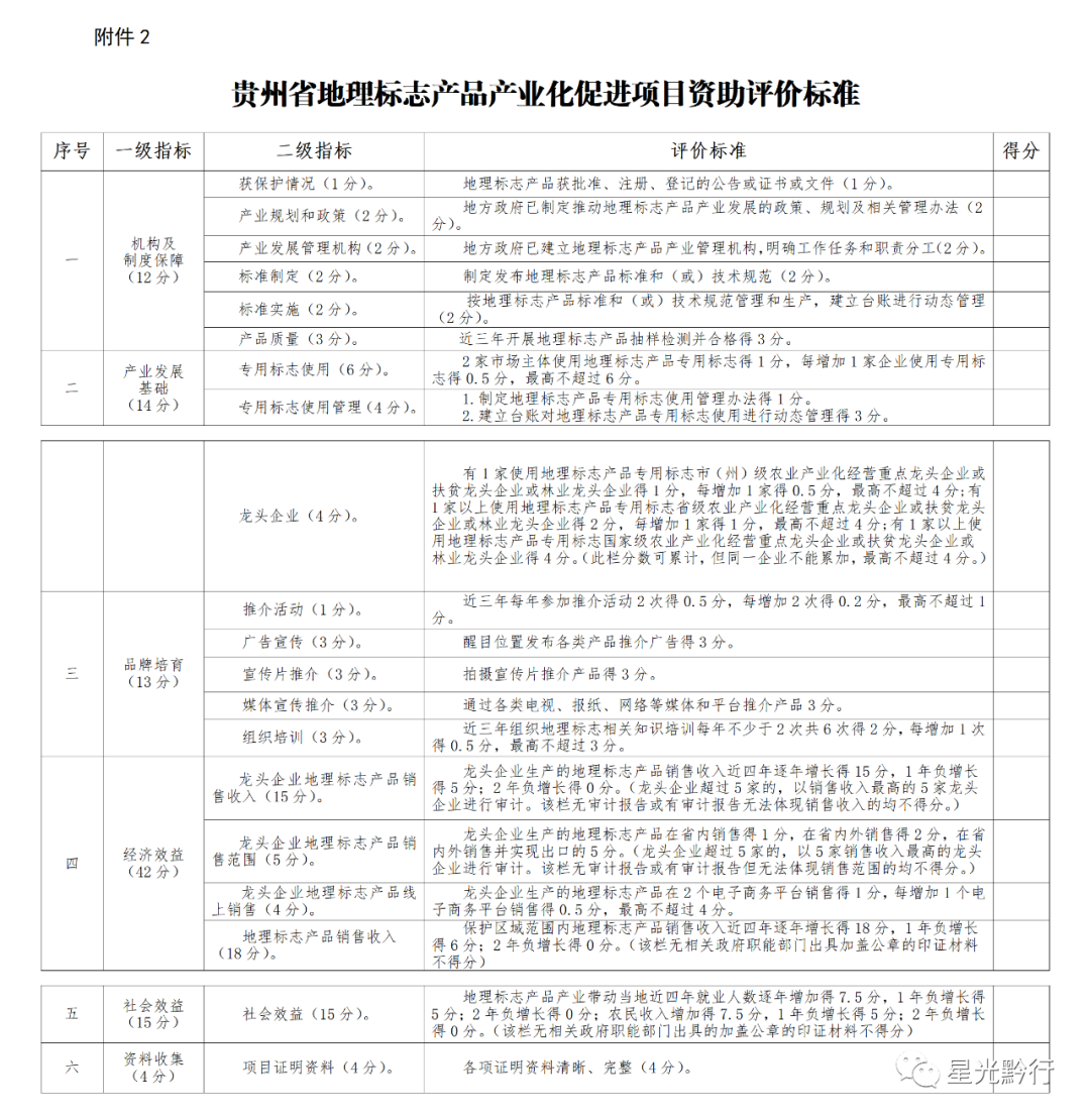 (四)评审。省市场监管局组织专家对申请项目进行评审,并依据《贵州省地理标志产品产业化促进项目资助评价标准》(详见附件2)对项目评价打分,提出专家评审意见。省市场监管局根据专家评审意见和评分情况,及当年预算额度提出拟资助项目建议名单,资助项目名额以本年度预算额度确定。专家评分低于60分的不纳入资助范围。